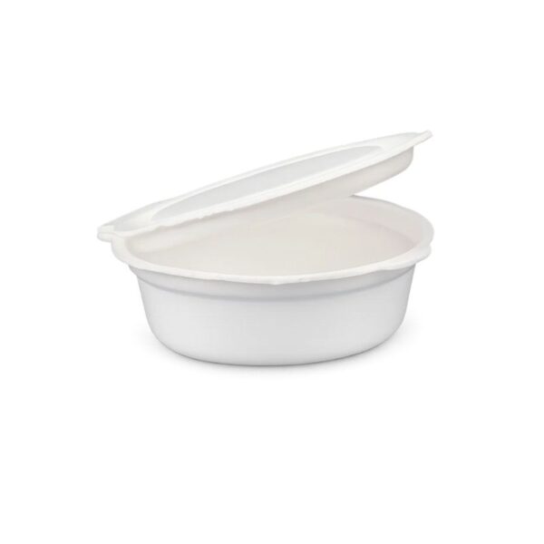 Envase redondo con tapa abatible, fabricado en plumavit, ideal para mantener la temperatura de alimentos calientes o fríos. Liviano, resistente y perfecto para delivery o comidas para llevar.